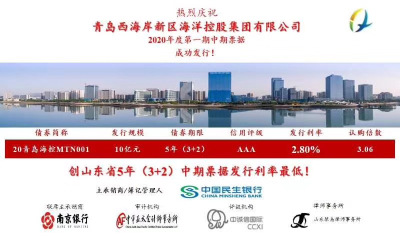 近日,??丶瘓F2020年第一期中期票據(jù)在銀行間交易市場成功發(fā)行,發(fā)行金額10億元,期限5(3+2)年,發(fā)行利率2.80%,創(chuàng)山東省國有企業(yè)同期限中期票據(jù)發(fā)行票面利率最低。此次中期票據(jù)的成功發(fā)行,是??丶瘓F與民生銀行戰(zhàn)略合作的成果,同時作為??丶瘓F首次在公開市場亮相,受到資本市場高度關(guān)注,有助于提升海控集團發(fā)展實力和資本市場認可度,為服務(wù)經(jīng)略海洋戰(zhàn)略發(fā)展奠定基礎(chǔ)。