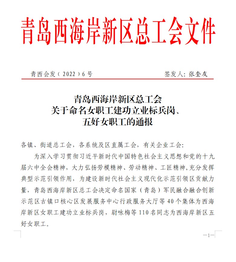 榜樣力量 | ??丶瘓F(tuán)法務(wù)和風(fēng)控管理崗獲評(píng)新區(qū)女職工建功立業(yè)標(biāo)兵崗